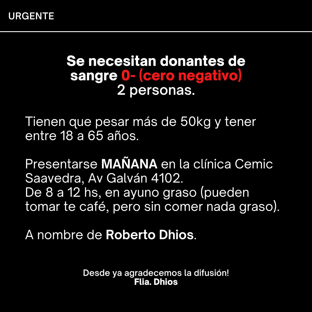 [Depfis] Se necesitan donantes de sangre 0 negativo para Roberto Dhios para mañana 9 de Marzo