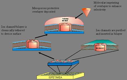 As part of a project centered on functionally incorporating ion channels in non-native and polymer- stabilized lipid bilayers, we are interested in characterizing the ion translocation behavior of the resulting assemblies. We have investigated several ion-channels with a view towards using them in tethered bilayers over microelectronic devices for eventual biosensor applications. The ion channel characteristics and their functional incorporation in bilayers will be presented. Single channel ion current fluctuations were measured by several methods and these data will be discussed. Finally methods to tether the ion channel/lipid bilayer assembly to solid state devices and protein-based techniques for stabilization will be presented.