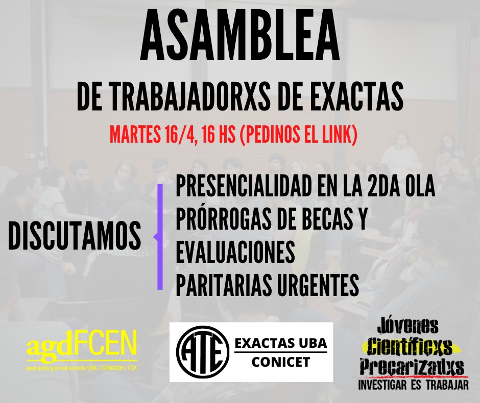 [Todos] Asamblea de Trabajadorxs de docencia e investigación en la FCEN - Viernes 16/4 - 16 hs (pedir link)