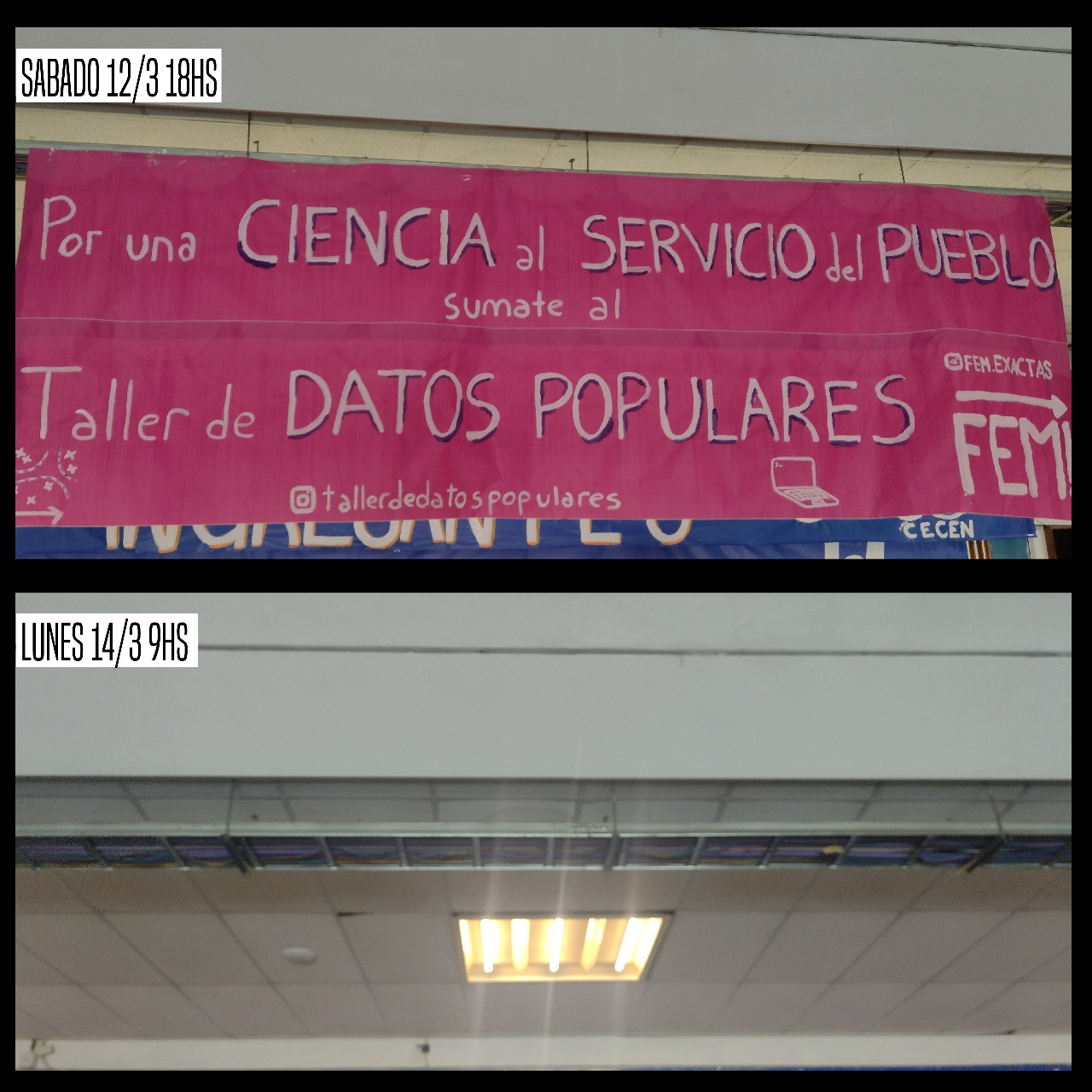 > Desde el retorno a la presencialidad con los cursos de verano, nuestros carteles son sistemáticamente arrancados durante los días domingos o por las noches por les militantes de esta agrupación. No hacemos esta denuncia en el aire, en exactas somos poques y nos conocemos mucho. En ocasiones, el Servicio de Higiene y Seguridad de la facultad retira carteles si resultan peligrosos, pero las autoridades nos han comunicado que este no fue el caso.