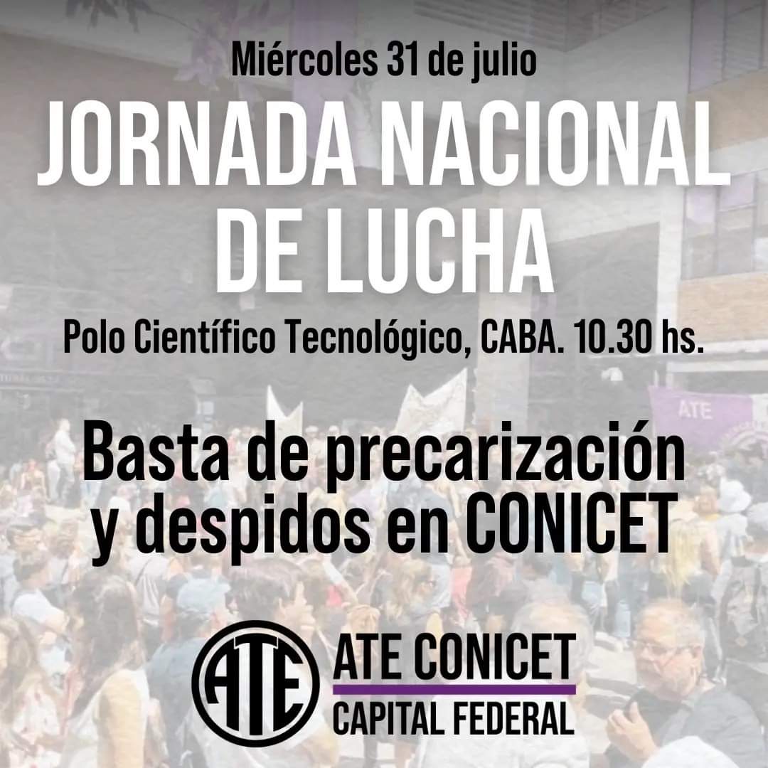 [Todos] BASTA DE PRECARIZACIÓN Y DESPIDOS EN CONICET - JORNADA NACIONAL DE LUCHA - MIÉRCOLES 31/7- 10.30 hs en POLO CIENTÍFICO