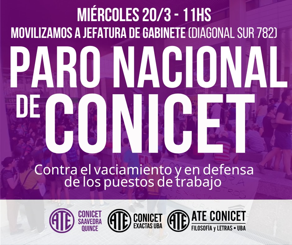 [Todos] Miércoles 20/3 - PARO Y JORNADA NACIONAL DE LUCHA EN CONICET - 11 hs movilizamos a JEFATURA DE GABINETE (Diagonal Sur 782)