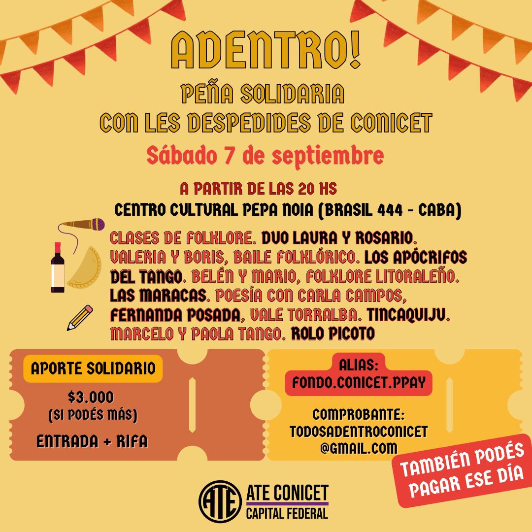 [Todos] Adentro! Peña solidaria con despedides de CONICET - Sáb 7/9, 20 hs, Centro Cultural Pepa Noia (Brasil, 444 - CABA)